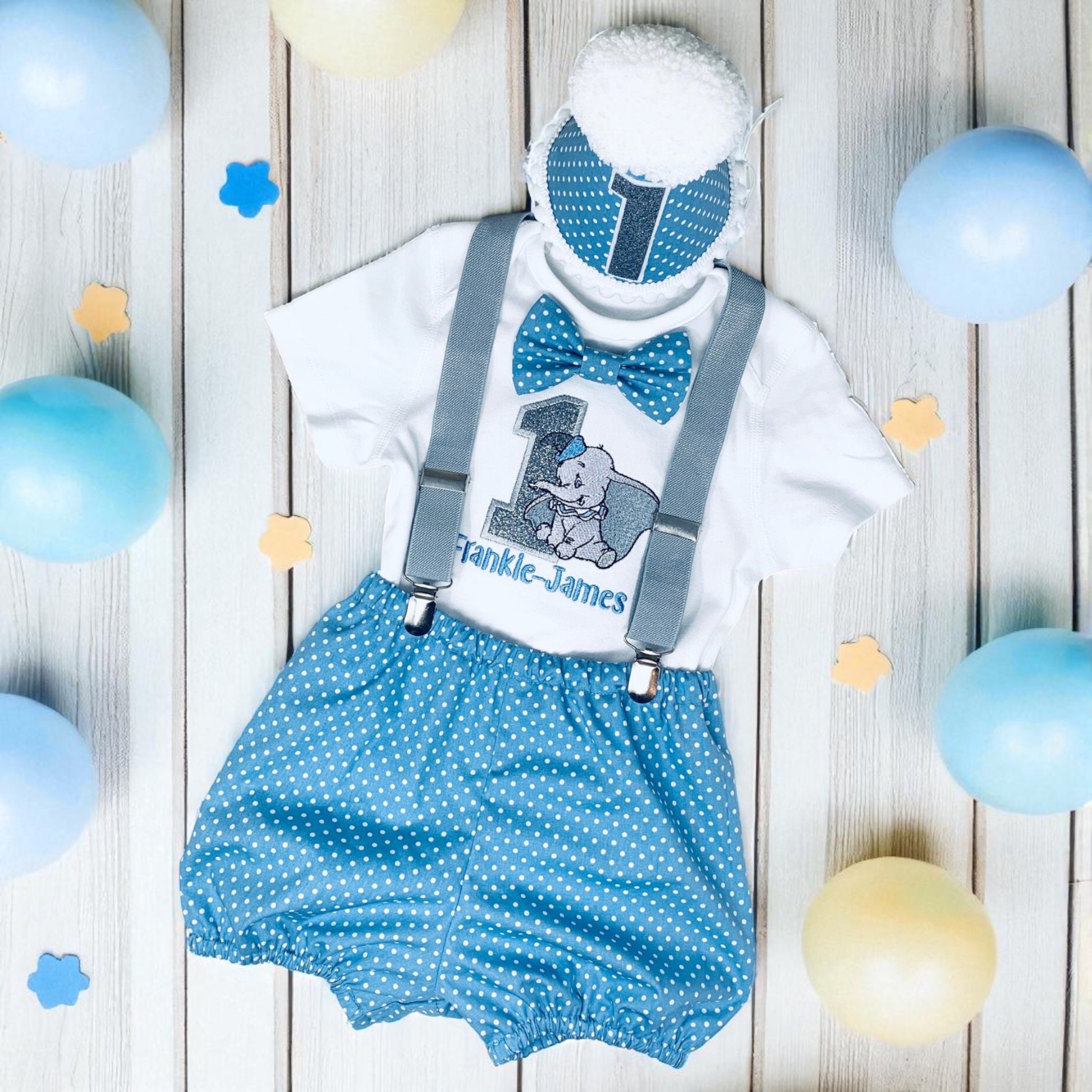 Dumbo Cake Smash Outfit – Blue Polka Dot Baby Boy Party Clothes with Custom Embroidered Vest