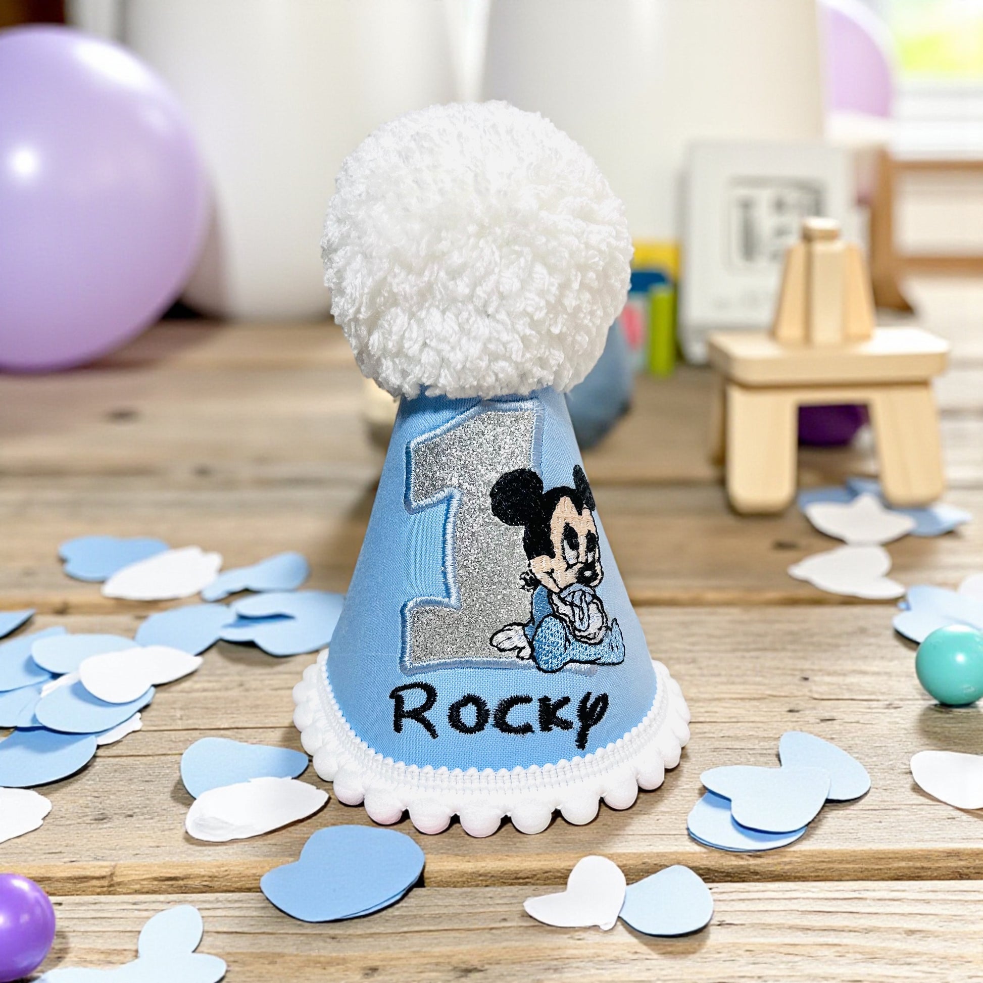 Mickey Mouse Birthday Party Hat – Personalised Baby or Toddler 1st Birthday Cake Smash Hat | Handmade Embroidered Party Accessory (Copy)