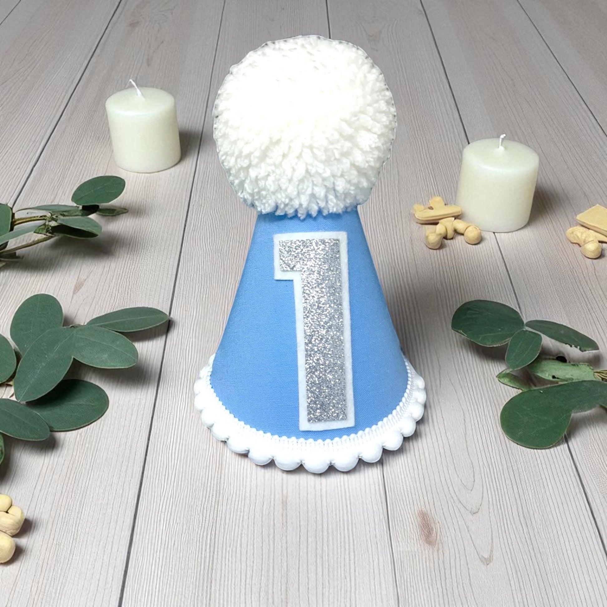 The coordinating party hat is decorated with a sparkling silver glitter birthday number, fluffy white pompom top, and white pompom trim, making it an ideal accessory for birthday photos and cake smash memories.