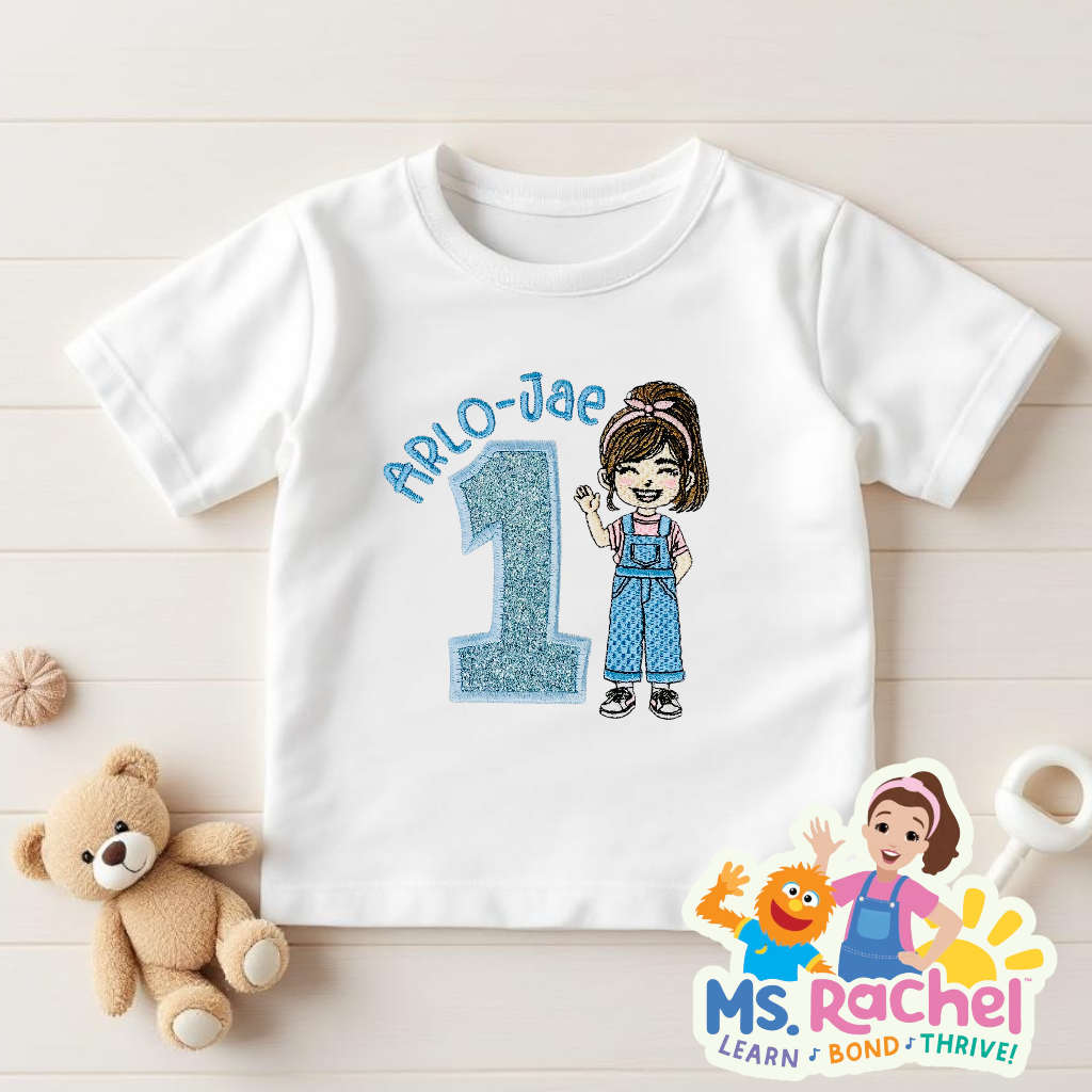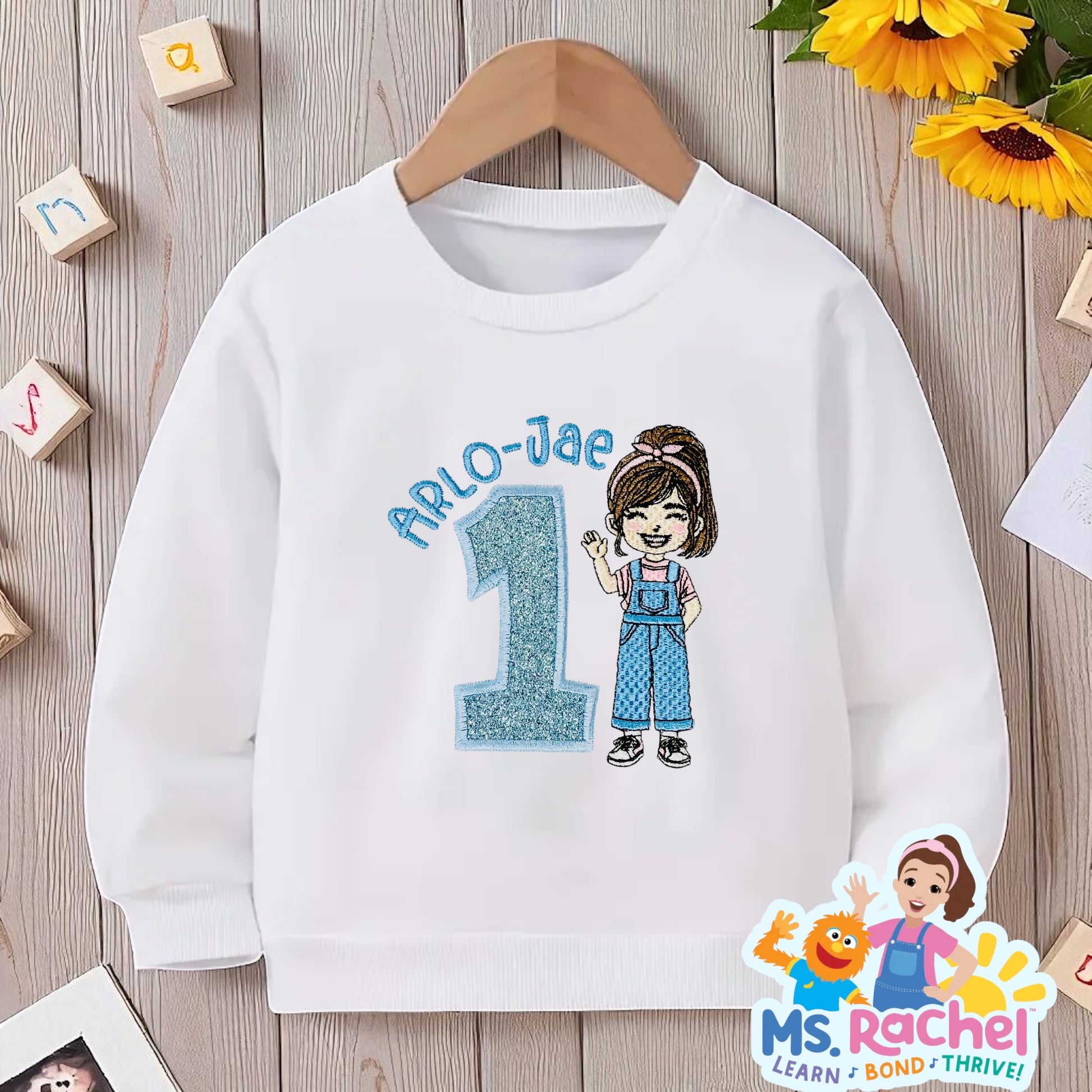 Personalised Ms Rachel Birthday Outfit – Cake Smash Bodysuit with Name & Age, Blue Bloomers, Braces & Party Hat – Also Available T-shirt or Sweatshirt