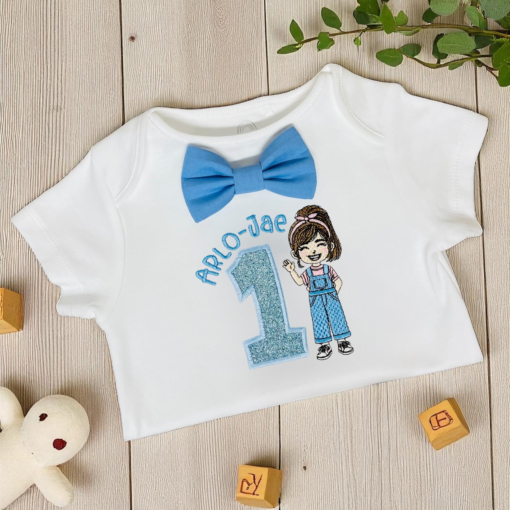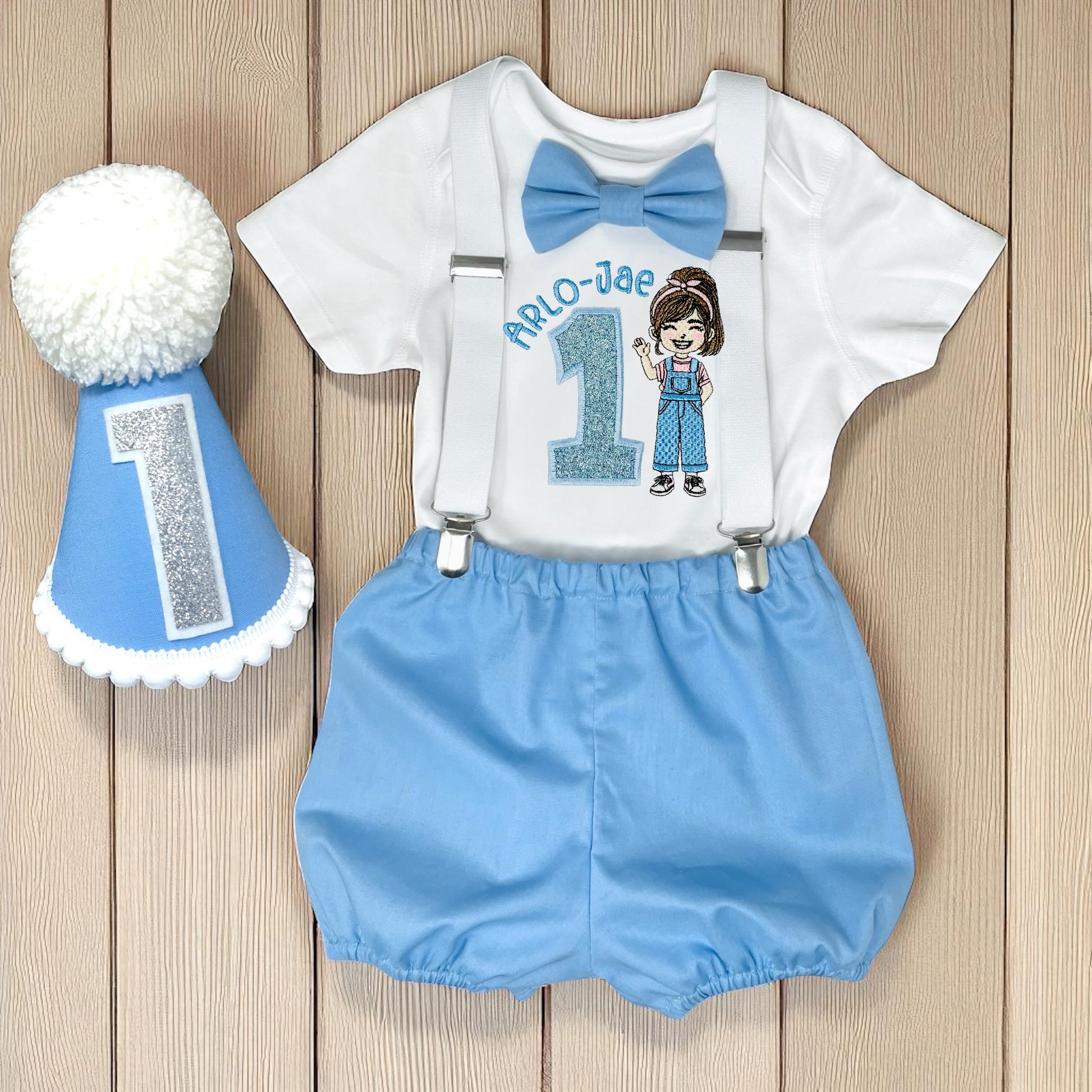 This adorable set includes a white embroidered bodysuit featuring a fun character-inspired design, your child’s birthday number, and their name. A smart bow, attached with a press stud, adds the perfect finishing touch and should be removed before washing. The matching bloomers are made from soft cotton in pastel blue, paired with adjustable white braces for a classic look.
